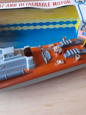 Playart Torpedo boat with 'Hi-Rev' Gold seal motor. The 'submarine' motor could be detached from the hull . It was powered by one Pencell or HP7 which is the modern AA. The boat has a surprising turn of speed considering it was powered by only one cell.