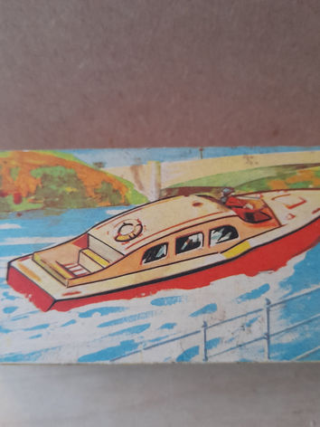 A lovely 9 inch clockwork cabin cruiser (model 167) Fantastic graphics on the box. I remember buying a couple of these on holiday in Beaumaris , Anglesey from the kiosk at the end of the pier. A quick run around to the boating / paddling pool behind the lifeboat station , and off we go .... Lovely memories.