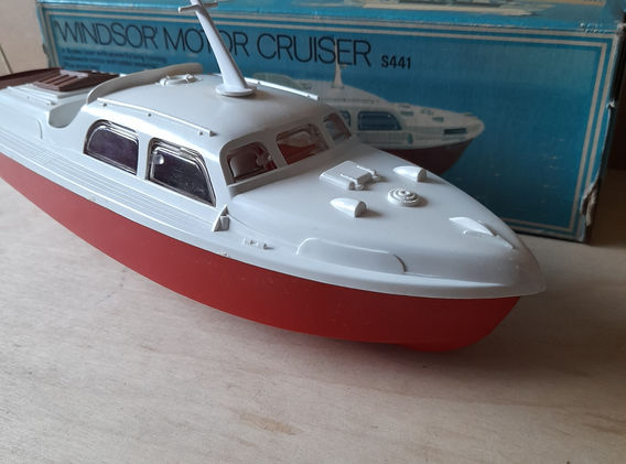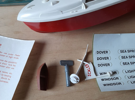 11 inch cruiser. Has all the accessories separate. A lovely complete model. This box can house a number of different models. Also , it is supplied with stickers on a sheet , rather than applied to the model. I would think this was a cost saving measure. This model also illustrates the connection between Tri-ang , Scalex and Penguin. The box has 'Tri-ang' and 'Scalex' markings , and the key is marked 'Pengiun'