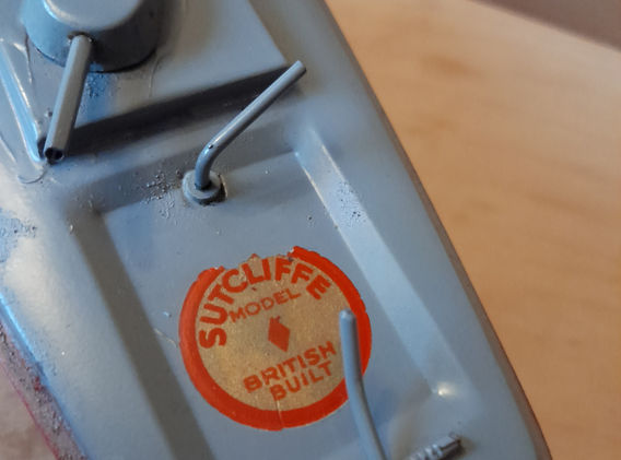 The Snappy Submarine chaser dates from about the mid thirties. Wound down the funnel , and it has a motor brake . This allows the motor to be wound without one having to hold the propeller with your finger. This example was supplied in a plain brown boxed stamped Sutcliffe in red ink on one end.